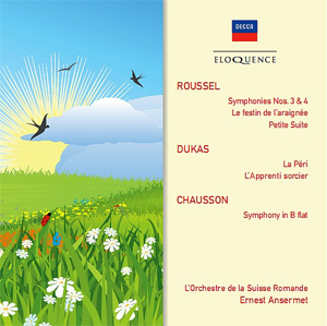 Le troisième double CD regroupe essentiellement tout ce que Ansermet a enregistré d'Albert Roussel (1869-1937). Vis-à-vis de cet admirable musicien français, il a ainsi agi en pionnier, car il est le premier à avoir gravé le ballet complet plutôt que la suite du Festin de l'Araignée, et il est également le premier à regrouper en un unique microsillon d'excellentes versions, énergiques, dynamiques et poétiques, des Symphonies n°3 en sol mineur et n°4 en la majeur, alors que seule la Symphonies n°4, avait tenté au disque mono Herbert von Karajan et Georges Tzipine ; par après, Charles Munch (la référence absolue) et André Cluytens allait suivre l'exemple d'Ansermet. Alors que l'ensemble des gravures Roussel d'Ansermet n'avait pratiquement été publié qu'en mono du temps du vinyle, nous avons la chance grâce au CD de les entendre toutes en superbe stéréo dans la présente réalisation qui nous offre en prime la première mondiale en CD de la Petite Suite par Ansermet. En réécoutant tout cela attentivement, on se rend compte que des exécutions sont toujours actuelles et restent des références incontestables tant du point de vue musical que technique, et il se peut même que Le Festin de l'Araignée soit une référence absolue par l'indicible poésie qui s'en dégage, alliée à une impeccable précision orchestrale … d'horloger suisse ! Ce double CD est complété – si l'on peut dire ! – par des interprétations sensationnelles de La Péri (avec sa Fanfare) du même niveau d'exception que celles de Pierre Dervaux ou Armin Jordan, de L'Apprenti Sorcier de Paul Dukas, et de la Symphonie en si bémol d'Ernest Chausson prise à un tempo plus modéré que de coutume, lui donnant ainsi une ampleur insoupçonnée. En conclusion, il ne fait aucun doute qu'à l'audition de ces joyaux discographiques, l'ennui soit d'un bout à l'autre rigoureusement banni ! …