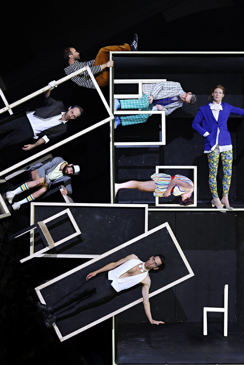 Une roue infernale occupe en effet le fond de scène. Un immeuble d'habitation en miniature dont tous les appartements communiquent, défiant les lois de la gravité. Y vit une communauté de voisins qui s'ébauche au fil des scènes, chacun rendant visite à l'autre. Si l'écriture chorégraphique collective est plutôt rare, à l'exception de scènes de groupe hilarantes (le cours de yoga, notamment), chaque interprète a l'occasion de montrer son talent et sa personnalité dans un ou plusieurs numéros.