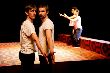 « Augures ». Conception et chorégraphie : Emmanuelle Huynh. Collaborateur artistique : Pascal Quéneau. Fabrication et interprétation : Nuno Bizarro, Talia De Vries, Yoann Demichelis, Corinne Garcia, Fragan Gehlker, Christophe Ives, Betty Tchomanga. Conception scénographique et costumes : Nadia Lauro, assistée de Romain Guillet. Lumières : Yannick Fouassier. Son : Olivier Renouf