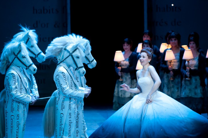 La très belle scénographie de Barbara de Limburg pour la Cendrillon de Massenet est essentiellement faite de grands panneaux sur lesquels sont reproduits, en caractères anciens, les premières phrases du conte de Perrault. Ce livre s'ouvre, se referme, se modifie à l'infini pour donner vie au cadre de l'histoire de Cendrillon. Les costumes, leurs coupes et leurs couleurs, sont à l'avenant. C'est dans ses souvenirs de lectures enfantines qu'a puisé Laurent Pelly pour mettre en scène la féerie de Massenet. Avec juste ce qu'il faut d'humour et tendresse, le metteur en scène réussit là l'un de ses meilleurs spectacles. Avec une infinie poésie aussi dans le traitement des passages féériques lorsque la fée habille Cendrillon pour le bal (à l'acte I), puis réunit les deux amoureux (au III.) La production entière est à l'image de la robe de bal de Cendrillon : moderne mais intemporelle, avec les paillettes que l'on attend mais sans tomber dans le kitsch.