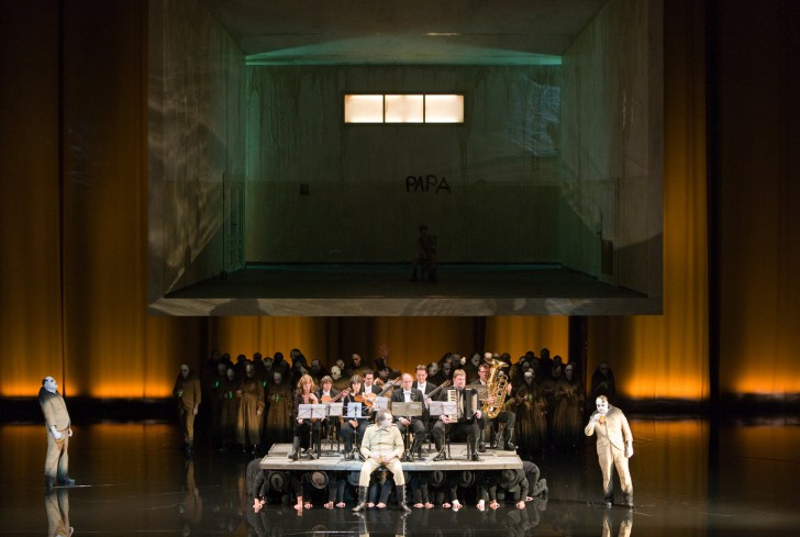 Andreas Kriegenburg a choisi une tout autre voie, en usant de la force de frappe esthétique d'un décor proprement sidérant, immédiatement lisible mais techniquement virtuose : une grande boîte semblant flotter au-dessus d'un plan d'eau au ras du sol, où s'opposent ainsi le champ de l'intime (la boîte, qui s'avance et se recule à volonté, étant aussi bien la chambre du capitaine que celle de Marie) et sphère publique, où les interludes sont animés par des figurants qui ne permettent pas d'oublier l'ancrage social et politique du texte de Büchner, écrit en pleine période romantique mais d'une actualité aussi brûlante pendant la République de Weimar qu'à l'ère des crises financières contemporaines.