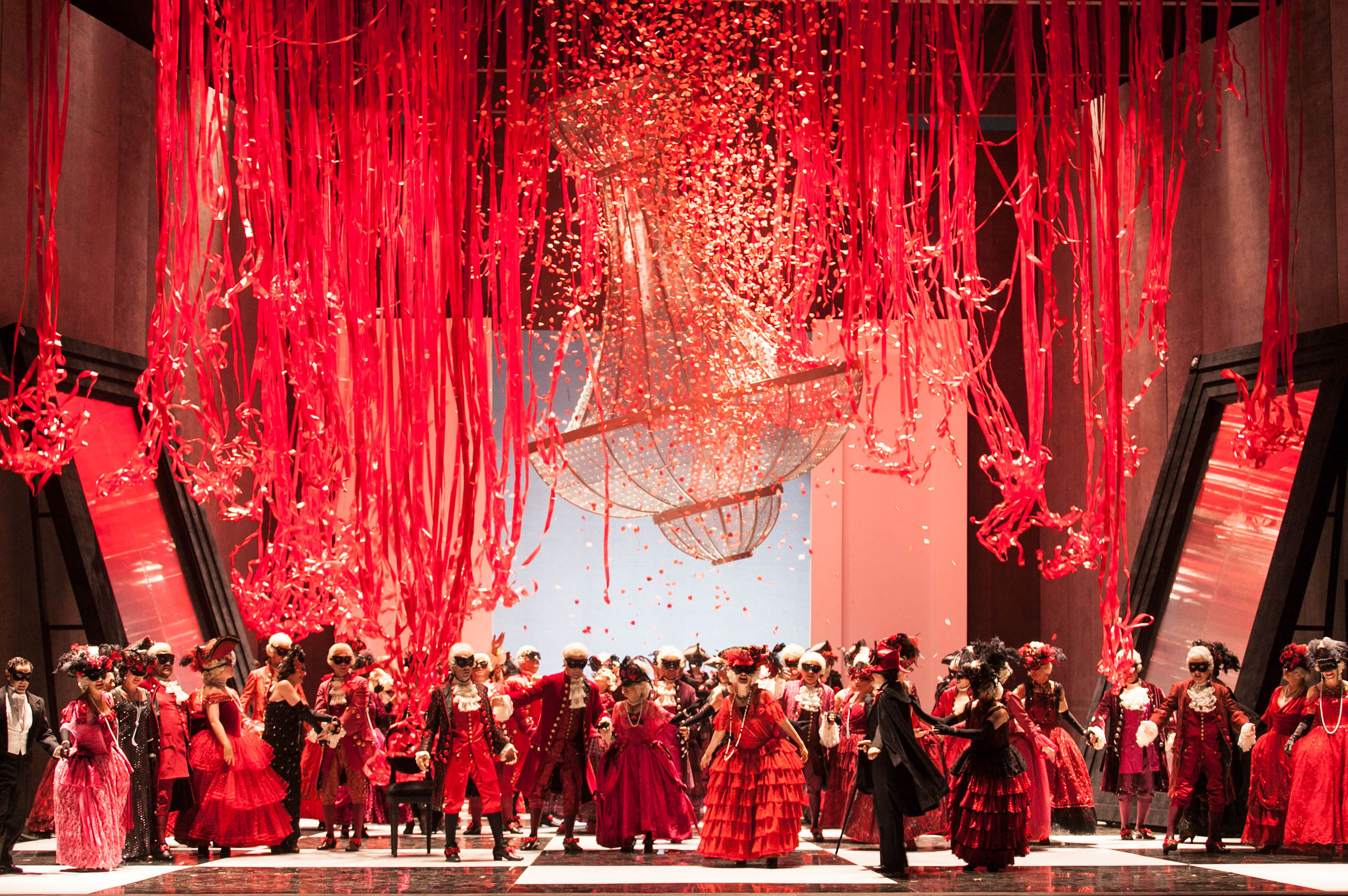 Difficile cependant d'être charmé par les décors monumentaux (Maurizio Balò). Avec ces hautes portes, parois blanches où penchent d'immenses et improbables tableaux, sols à grands damiers noirs et blancs, intérieurs nus du palais, la beauté des costumes se voit ainsi réduite par le gigantisme et le kitch des décors. Ainsi l'antre d'Ulrica, plateau circulaire incliné baigné d'une lumière d'un rouge électrique reste d'un goût douteux et d'un effet plus pompier que terrifiant. Si l'idée dominante de montrer un monde perdant ses lignes en inclinant tel ou tel élément du décor, le champ de potences où pousse la mandragore, avec ses démesurés gibets inclinés s'avère d'une utilité scénique discutable dans la difficulté pour les protagonistes de se mouvoir dans cet entrelacs d'échafauds et de cordes. Cependant, certaines scènes restent spectaculairement belles, comme lorsque la foule du bal masqué vêtue de ses costumes rouges envahit brusquement le plateau sur lequel tombent soudain une multitude de guirlandes et de pétales de roses rouges.