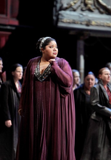 Ferruccio Furlanetto campe un Attila de force dix. Le personnage, frustre, féroce et rude, mais aussi circonspect et prudent, sait à merveille, tout comme Verdi malgré ses proclamations, gommer les aspérités de l' Histoire, se montrer grande âme, humain, qui ne ressent pour le traitre Ezio que mépris et dédain. La voix, musclée, brutale, joue des couleurs et des intonations avec maestria. Aisance, fougue, panache, tout y est … sans oublier ces ineffables pudeurs dans l' expression. Nathaniel Peake (Uldino, prise de rôle) l' accompagne avec talent. Quinn Kelsey, lui aussi en prise de rôle, possède une présence scénique indiscutable. La voix, chaude et bien placée, son timbre prenant, un Attila, avrai tu l' universo, resti l' Italia a me font instantanément mouche. Une énaurhme découverte … l' Odabella de la jeune Lucrecia Garcia, qui s' impose d' emblée, dès le Santo di patria. Scéniquement. Vocalement. Odabella saura user d' audace et de ruse, de séduction pour décemment venger son père. Sa vision sera tendue, rigoureuse, homogène. Alerte et pétillante, totalement impliquée, Garcia chante et joue avec … gourmandise. Une voix fraîche et franche, persuasive, admirablement forgée, une agilité étonnante (l' aplomb de la vocalise !), des aigus nets, insolents, un contrôle surprenant du souffle … on reste sidéré, abasourdi. A suivre … et de très très près. Prise de rôle également pour Diego Torre, passionné, enlevé, abouti. Mais la voix ne suit pas. Bloquée, jamais elle ne s' ouvrira. L' aigu sent l'effort … le grave, la tension. Frustrant. Au pupitre, Nicola Luisotti, tout en nerfs, adopte des tempi lestes et vifs, précipités, mène son Verdi tambour battant… et c' est très bien ainsi.