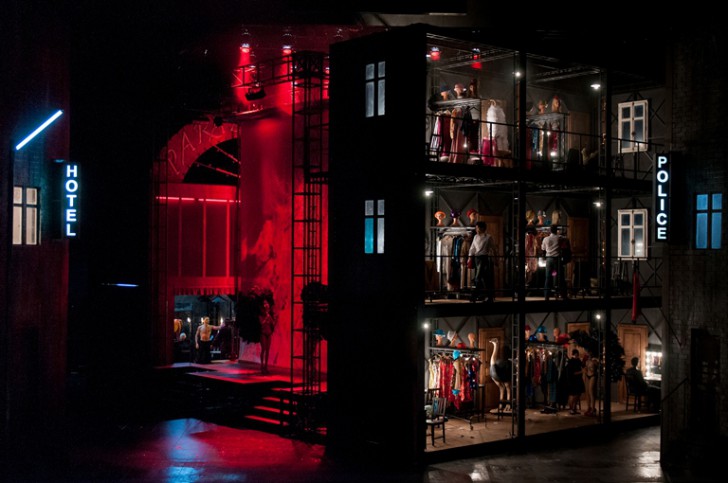 Avec son décor tournant, parfois grinçant et bruyant, entre un hôtel à jardin et un commissariat de police à cour, les épisodes se succèdent tantôt sur une scène du théâtre de Carmen, tantôt dans ses loges ou encore dans l'auberge de Lillas Pastia, dans un bric à brac d'éclairages, d'escaliers, de portes, de passages, sur un fond de scène de brousse africaine et de palmiers aux verts pétants d'un effet kitch de mauvais goût.