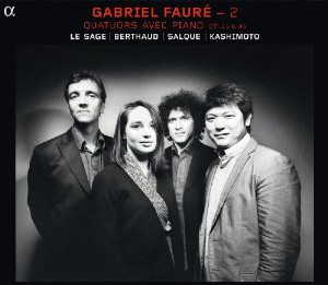 Gabriel Fauré (1845-1924) : Quatuor n°1 en ut mineur op. 15, Quatuor n°2 en sol mineur op. 45. Eric Le Sage, piano ; François Salque, violoncelle ; Daishin Kashimoto, violon ; Lise Berthaud, alto. 1 CD ALPHA ALPHA601. Code barre : 3760014196010. Enregistré en mars 2011 à l’auditorium MC2 à Grenoble. Notice de présentation en : Français, Anglais. Durée : 64’09mn.