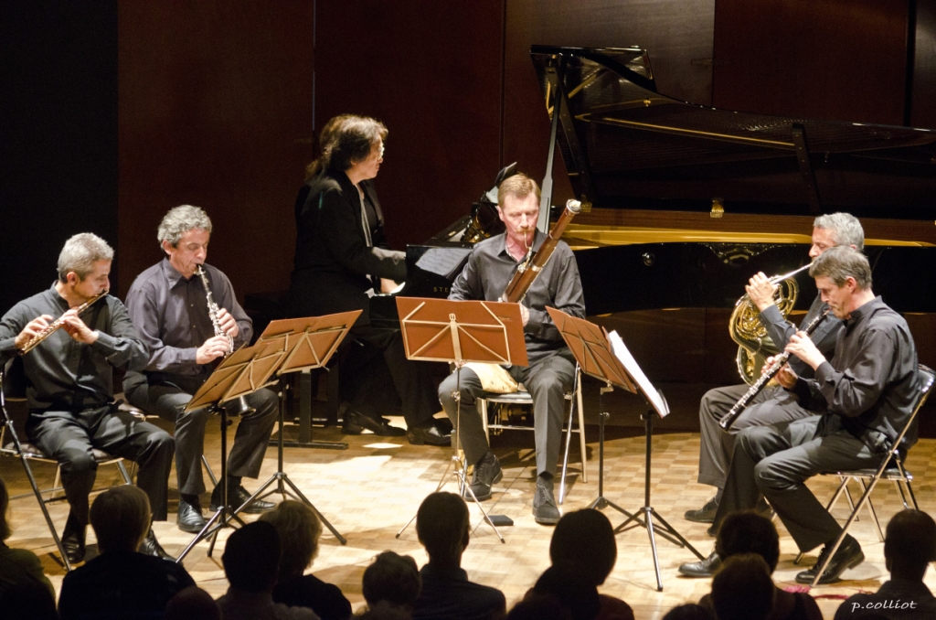 Le 17 août, le Quintette Moraguès et le pianiste et directeur artistique du festival, Kun Woo Paik nous offrent des œuvres, assez mal connues du grand public, d'André Caplet (1878-1925), de Gabriel Fauré (1845-1924) et de Francis Poulenc (1899-1963). Mais ce sont les Six Bagatelles pour quintette à vent de György Ligeti (1923-2006) qui ouvre la soirée, avec un accent humoristique. Dans la Quintette pour flûte, hautbois, clarinette, basson et piano de Caplet, œuvre de grande envergure à caractère grave, chaque instrument à vent est honorablement mis en valeur dans une excellente interprétation. Seul, le son du piano est très métallique, se distinguant nettement de l'ensemble ; mais il est difficile de savoir si cela est dû à l'accordage ou aux panneaux qui couvrent le derrière de la scène ou encore à l'acoustique perçu de la place où nous étions. Ce petit déséquilibre se poursuit dans Pelléas et Mélisande de Fauré (transcrit par notre hautboïste David Walter), mais dans le Septuor pour quintette à vent de Poulenc, ce son du piano se fond avec bonheur aux vents, créant une atmosphère joyeusement tapageuse. En bis, une transcription de la « chanson bohème » du début du deuxième acte de Carmen, et une mélodie tzigane que les artistes exécutent avec beaucoup d'humour.