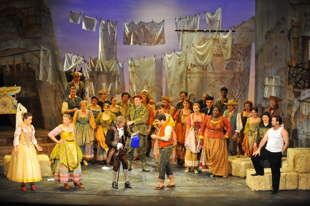 Curieusement, on se prend à déguster en toute naïveté cette accumulation de gags dont la lourdeur finir par devenir comique, sans doute grâce à leur anachronisme assumé : Belcore, arrivé sur la scène en parachute, ne cesse de répondre au téléphone ; Dulcamara est le psy attitré de nos jeunes tourtereaux ; Adina est l'institutrice du village, etc. Mais si l'on est finalement touché par toutes ces déambulations, c'est aussi parce que la mise en scène ne badine pas avec les sentiments, et que les personnages restent finalement crédibles et sincères dans leur (petite) folie et dans leurs (grands) débordements. Adina et Nemorino sont à croquer, elle dans son aveuglement et lui dans ses bouderies, et l'on finit par prendre en pitié les malheurs de Belcore et la frustration de Dulcamara. La direction d'acteurs, particulièrement fluide et soignée, ne laisse aucun moment de répit pour l'œil et pour l'esprit. On pardonnera donc au metteur en scène d'avoir tiré l'opéra comique de Donizetti vers l'opérette, voire vers la comédie musicale. Car de très beaux tableaux, comme par exemple l'arrêt sur image au moment du premier air de Némorino (« questa o quella »), ou encore la scène jouée au ralenti lors du finale concertant du premier acte, permettent de suggérer les non-dits de l'action et d'accéder à la vérité intérieure des personnages. On comprend mal, en revanche, pourquoi la déclaration d'Adina à Nemorino, un des moments les plus touchants de l'ouvrage, est gâchée par la présence intempestive de Belcore…