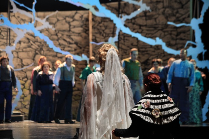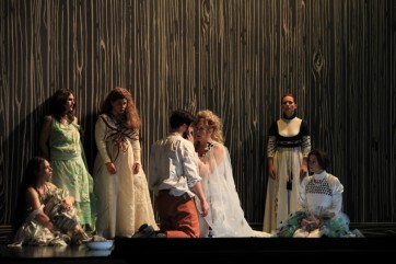 La cohérence du spectacle est assurée par la mise en scène intelligente de , aidée par une costumière de talent, par une mise en lumière raffinée. Les décors jouent beaucoup sur des mouvements économes de praticables mobiles, et cela évoque à merveille l'impression d'enfermement ou bien de lumière retrouvée. Les costumes de la foule des paysans, dans des camaïeux de bleus et de verts, servent d'écrin au blanc, comme parsemé de négatifs photographiques, de celui d'Ariane, comme à celui, noir, de la Nourrice ; et les vêtements des cinq prisonnières rappellent à juste titre ceux des mariées de la Belle Epoque.
