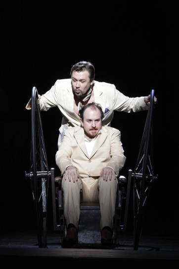 Ne soyons pas ingrats, il y a quelques idées aussi dans cette mise en scène. Ainsi, Rigoletto est tout sauf bossu. Son handicap – dont, pourtant, il ne cesse de parler – n'est qu'intérieur, nous rappelle Schilling. Au premier tableau, le chœur est assis sur d'immenses tribunes, au milieu de figurants et de mannequins, tous vêtus de costumes clairs. Tant pis si la musique nous peint une scène de bal. Giovanna et Maddalena sont ici un seul personnage, tout comme Monterone et Sparafucile. Ce dernier d'ailleurs, se promène avec un fauteuil roulant aux roues gigantesques. Pourquoi ? Nous ne le saurons pas. C'est dans ce fauteuil que Gilda, vêtue d'une robe de mariée, prend place pour se faire tuer, alors que Maddalena vide un sceau de peinture noire sur elle. Evidemment, Gilda reste bien visible lorsque Rigoletto revient. Mais pourquoi, diable, croit-il tenir en ses mains le corps du duc ? Là non plus, nous ne le saurons pas.