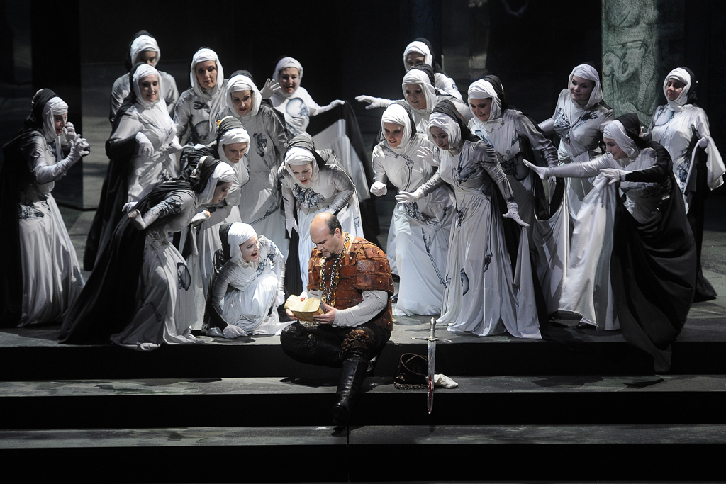 Contrairement à notre confrère, qui en déplorait le kitsch et le grand guignol, la mise en scène de Jean-Louis Martinoty nous semble plutôt devoir être mise au compte de ses réussites. Certes, la qualité de la distribution réunie à Nancy est très certainement à prendre en compte dans le succès du spectacle, nous y reviendrons. Pour ce Macbeth, heureusement contraint par l'espace scénique et les possibilités techniques plus réduites d'un théâtre de province, Jean-Louis Martinoty a su resserrer son propos et ne pas se laisser déborder par les références plastiques ou picturales ; l'exact inverse de ce qui s'était passé pour son catastrophique Faust à l'Opéra-Bastille. La scénographie évocatrice et efficace de Bernard Arnould est faite de colonnes mobiles, tour à tour miroirs, statues de palais ou arbres de la forêt de Birnam. Les sorcières sont au centre du dispositif. Femmes-Janus à double face, quasiment nonnes côté face, squelettes à tête de mort côté pile, elles sont omniprésentes et, par un savant jeu de reflets, apparaissent épiant et contrôlant les protagonistes même quand elles sont hors scène. Martinoty n'édulcore pas l'horreur de la tragédie shakespearienne, montrant sur scène Macbeth poignardant les gardes de Duncan ou l'assassinat des enfants de Macduff, mais nous épargne le sang et le gore. La version choisie est globalement celle de la reprise parisienne de 1865 mais, pour plus d'efficacité dramatique, l'opéra se conclut sur la mort de Macbeth comme dans la version florentine initiale de 1847. De même, le ballet de 1865 est omis au profit d'un page orchestrale de 1847 qui donne lieu à l'apparition de poupées monstrueuses, inspirées par le surréaliste Hans Bellmer, et qui n'est qu'un cauchemar de Macbeth. En fin de compte, un spectacle plutôt classique de facture, lisible et parfaitement respectueux de Shakespeare.