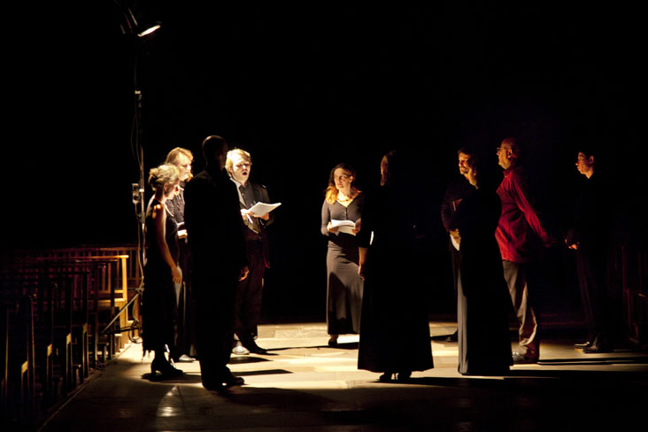 Après la Troisième leçon des ténèbres du Samedi Saint de Cristobald de Morales dont l'exigence quant au contrepoint et à la conduite des lignes mélodiques mettait à mal la justesse et l'équilibre des six voix a capella, la soirée se terminait avec la création française de Devequt II du compositeur italien Gianvincenzo Cresta, une pièce inspirée des récits poétiques (Laudes) de Jacopone da Todi et de l'expérience talmudique d'union totale avec Dieu, « thème constant de la Kabbale, du Mussad et de la littérature hassidique » précise le compositeur sans donner la traduction des textes italiens utilisés; sans doute parce que son travail se situe au-delà du sens, dans la recherche d'un son « chargé d'indicible » comme il aime à le préciser. Minimales autant que raffinées, les textures vocales forment un tissu flottant sur lequel l'alto imprime ses propres figures dans une très belle intégration de la ligne instrumentale au sein des sept voix. Mais à deux reprises, l'alto soliste devient « voix narrative », empruntant un profil ornemental et stylisé très singulier, sorte de méta-langage que Christophe Desjardins, très habité, semble porter jusqu'à la transe.