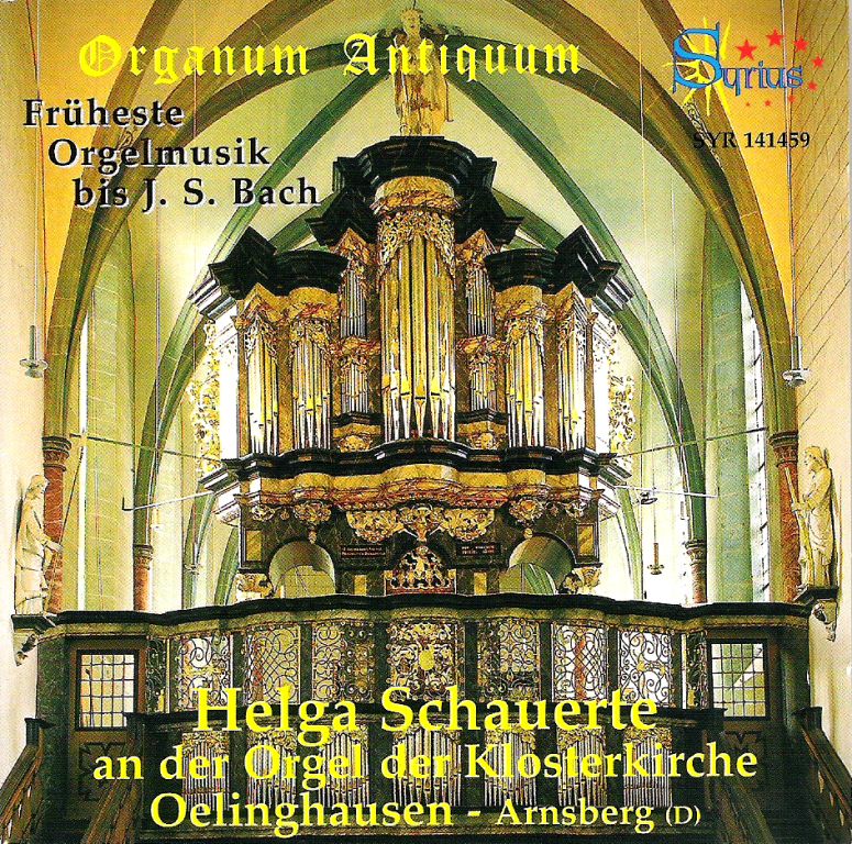 Les origines de l’orgue allemand jusqu’à Johann Sebastian Bach (1685-1750): Chorals BWV 245/5, BWV 636, BWV 737. Helga Schauerte à l’orgue gothique de la Klosterkirche d’Oeinghausen- Arnsberg, Allemagne. 1 CD SyriusSYR 141459. Code barre : 3491421414595. Enregistré en septembre 2012. Livret trilingue allemand/français/anglais. Durée totale 71’13 ».