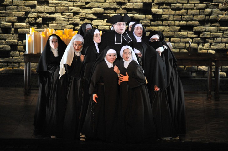 La vision de Mireille Delunsch reste traditionnelle, nous sommes bien dans un couvent pendant la Révolution française. L'action reste plutôt statique, de bonnes idées sont mises à l'oeuvre (Madame de Croissy avant de mourir serre Blanche dans ses bras un peu trop affectueusement, provoquant la colère justifiée de Mère Marie, Blanche devant le catafalque de la Prieure est effrayée par sa propre ombre devenue démesurée, …) parfois polluées par des détails inutiles (pendant l'entretient entre Blanche et son frère une petite fille joue à la marelle et Mère Marie, présente par obligation, fait du tricot), des incongruités (Mère Marie défroquée a une chevelure d'une malade atteinte du cancer en chimiothérapie) ou des déplacements injustifiés. Les relations entre les personnages, si importantes, sont parfois peu approfondies, comme la rivalité entre Mère Marie et la nouvelle Prieure. Toutefois les scènes s'enchaînent les unes aux autres par d'astucieux changements, sans temps mort, le tout rehaussé par la scénographie de Rudy Sabounghi et les excellents jeux de lumières de Dominique Borrini.