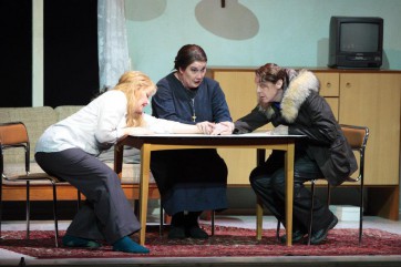 Tous investissent consciencieusement les quelques indications que leur laisse la mise en scène sagement illustrative de Barbara Frey, actualisée par petites touches (la sacristine a l'électricité et même la télévision) mais sans grand profit. Surtout, il est regrettable que les éléments d'interprétation personnelle qu'elle tente d'apporter soient en quelque sorte réduits à occuper le fond de scène sans toucher les personnages. Les éoliennes du premier acte sont sans doute un habile équivalent du moulin, puisqu'elles aussi sont une manière de tirer profit des forces d'une nature qui, dans ce monde rural, n'est jamais esthétisée ; il n'est pas intéressant que la puissance locale des Buryja soit rappelée au deuxième acte par l'immense mât d'éolienne qui la domine et l'écrase. Mais on n'en apprendra pas plus sur les émotions des personnages, sur les relations sociales, sur le poids des traditions.