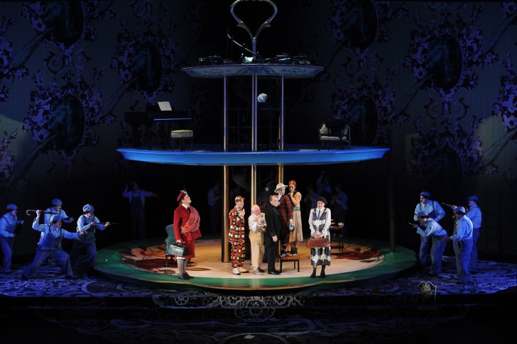 La mise en scène de déplace légèrement l'action dans les années 20, dans un décor unique qui représente un gigantesque serviteur muet – ce plat de présentation de gâteaux ou de desserts fait d'assiettes superposées de taille décroissante – posé sur un tout aussi énorme napperon, sur fond de papier peint victorien faisant la part belle au lion rugissant de l'Empire britannique. Les costumes d'Annemarie Woods sont parfaitement extravagants, comme il convient à cette société si préoccupée de son apparence. réussit plutôt bien la gageure d'animer cette succession de dialogues par essence statiques en rajoutant une armée de clones de Charlie Chaplin (les domestiques et le chœur), en variant les entrées et en diversifiant sa direction d'acteurs.