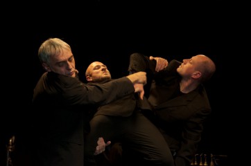 Le dispositif scénique imaginé par le chorégraphe est original. Des gradins sont disposés tout autour d'une scène circulaire, dans laquelle sont encastrés deux musiciens multi-instrumentistes (percussions, cordes frappées…) dont le compositeur Akosh Szelevényi. L'espace restant disponible pour les trois danseurs est limité, d'autant qu'ils sont vêtus de combinaisons rembourrées qui les font ressembler à des bibendums Michelin. A la faveur d'une trappe aménagée dans le décor, ils se dépouillent de leur matelassage pour se retrouver en costume noir – attribut traditionnel des spectacles du chorégraphe d'origine hongroise.