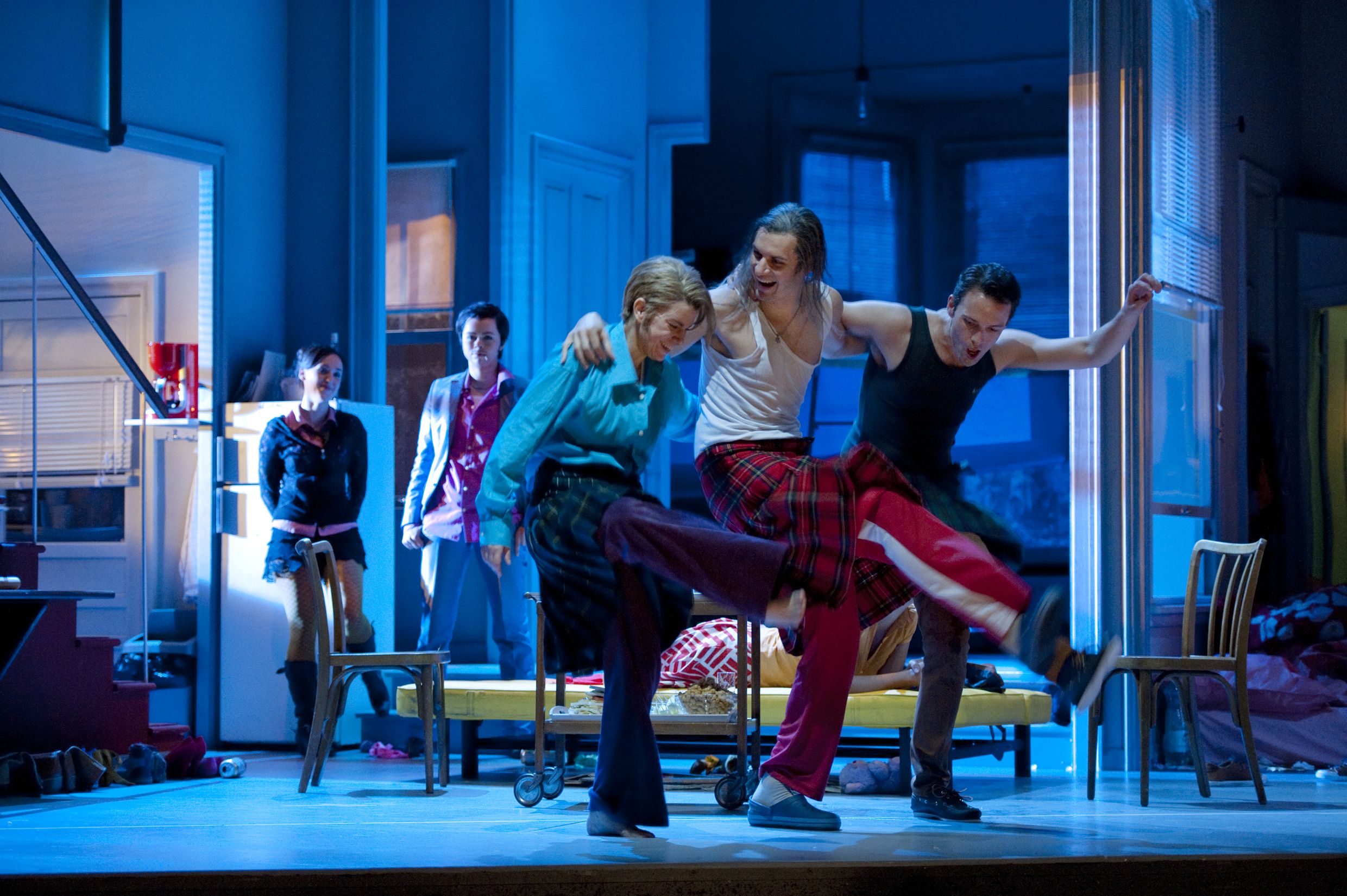 Alors d'emblée on est frappé par la direction tonique et le sens théâtral du chef, favorisant la générosité du son de l'orchestre, intensifiant les moments dramatiques comme dans les sinfonie qui soulignent les tourments chimériques de Ginevra à la fin du deuxième acte ou la délicatesse de certaines pages comme l'air « Scherza infida ». Côté mise en scène, Johannes Schütz a choisi de transposer le drame dans un décor et des costumes contemporains : nous sommes à l'intérieur d'un appartement de jeunes étudiants qui cohabitent, prennent l'apéro, font la fête, dansent, se séduisent, se trompent et se détestent. Le décor fixe montre l'ensemble des pièces qui constitue cet appartement d'étudiants désordonnés : chambre et salle de bain d'un côté, salon, cuisine, garage à bateau et porte donnant sur une supposée cave de l'autre, ainsi qu'un escalier qui mène à une autre chambre. La transposition peut surprendre et l'on peut comprendre qu'elle ait pu dérouter un public salzbourgeois plutôt conservateur. Pourtant cette mise en scène se tient et fonctionne même plutôt bien, offrant des moments délicieusement ambigus comme lorsque Ginevra repousse violemment Polinesso tout en lui tendant sa jambe dénudée pour qu'il la lui caresse. Cette séductrice finira non pas par fauter avec ce dernier mais cèdera aux avances d'un autre (Il re di Scozia : colocataire ou père incestueux ?) ce qui va susciter la colère d'Ariodante qui pensait sa Ginevra fidèle et susciter la folie de cette dernière, rongée par les remords. Lurcanio est le garçon sérieux du groupe, il ne parvient pas à « dompter » la délurée Dalinda qui s'intéresse plutôt au mauvais garçon Polinesso qui va la manipuler… Le public salzbourgeois n'a pas supporté ! Il s'est bruyamment manifesté notamment lorsque Ginevra fait une fellation au Re di Scozia. L'idée, certes provocante, se justifie pourtant : il ne s'agit pas de montrer une scène sexuelle comme telle mais d'illustrer la scène du violent cauchemar de Ginevra à la fin du deuxième acte. En effet, elle s'imagine ici en train de se venger de tous ses colocataires en les tuant un par un et feint de prendre plaisir à la fellation pour pouvoir en fait trancher le sexe de son partenaire !