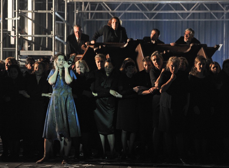 Assurément, Calixto Bieito excède la « contenance angloise », ainsi que, au XVe siècle, était dénommée la douce pondération, formelle et expressive, d'un John Dunstable. Il transgresse la distante pudeur et le noli me tangere (une façon de mélisandienne « ne me touchez pas ou je me jette à l'eau ») si propre à nos amis britanniques. Ainsi qu'il est de mise dans le théâtre européen contemporain, il agrippe le texte et lui fait rendre gorge de sa part de vérité. Ce faisant, il rend nécessaire la dernière (et réitérative) demi-heure d'une œuvre qui en dure trois ; les ressassements se muent en rituel litanique (pour « celui qui croyait au ciel ») ou en un bouleversant bégaiement (pour « celui qui n'y croyait pas », pour citer La rose et le réséda d'Aragon), telle Isabelle Huppert dans Passion de Jean-Luc Godard.