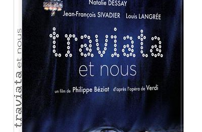 Traviata et nous, un film de Philippe Béziat d’après l’opéra de Giuseppe Verdi. Production : Philippe Martin. Image : Raphaël O’Byrne, Hichame Alaouié, Ned Burgess, Matthieu Poirot-Delpech. Son : Laurent Gabiot. Montage : Cyril Leuthy. Montage son : Françoise Méreu. Montage/premix des musiques : Thomas Dappelo. Mixage : Emmanuel Croset. Avec : Natalie Dessay, Violetta Valéry ; Jean-François Sivadier, mise en scène ; Louis Langrée, direction musicale ; Alexandre de Dardel, scénographie ; Virgine Gervaise, cosumes ; Philippe Berthomé, Lumière ; Charles Castronovo, Alfredo Germont ; Ludovic Tézier, Giorgio Germont ; Adelina Scarabelli, Annina ; Silvia de La Muela, Flora Bervoix ; Manuel Nunez Camelino, Gastone de Letorière ; Kostas Smoriginas, Barone Douphol ; Andrea Mastroni, Marchese d’Obigny ; Maurizio Lo Piccolo, Dottor Grenvil ; London Symphony Orchestra ; Estonian Philharmonic Chamber Choir. Enregistré lors des répétitions de La Traviata au Théâtre de l’Archevêché lors du festival d’Aix-en-Provence au printemps 2011. Sous-titrage en français. Notice en français. Format image : 16/9 compatible 4/3. Format son : 1.85 / 5.1. 1 DVD. Les Films Pelléas. Code-barre : 0822186 105054. Zone 0. Durée : 1h52’.