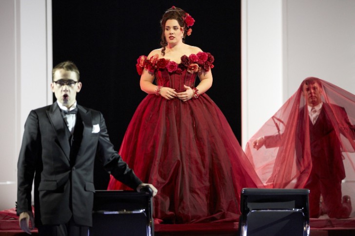 La mise en scène d'Andrea Moses, metteuse en scène en résidence à Stuttgart, se place exactement entre deux interprétations antithétiques de l'œuvre, l'une toute entière tournée vers la farce, telle que l'illustrait avec des abîmes de vulgarité le spectacle d'Irina Brook au Théâtre des Champs-Élysées, l'autre soulignant avec raison que la comédie est ici profondément nourrie de quêtes identitaires, de douleurs anciennes et de mondes en transition, comme avaient su le faire admirablement Patrice Caurier et Moshé Leiser à Londres, ou plus encore Arpád Schilling dans un spectacle bouleversant pour les jeunes membres du studio lyrique de l'Opéra de Bavière. Comme eux, Moses situe sa version dans un monde qui nous est familier – le chœur d'hommes, dont certains déguisés en rombières, prend avec beaucoup de conviction et d'énergie le rôle d'un « conseil d'administration » qui remplace l'héritage princier. Elle ne manquait pas d'idées pour construire une interprétation ambitieuse : elle sait donner à Alidoro – Adam Palka, une présence scénique étonnante et le meilleur chanteur du spectacle – un rôle de factotum à la fois souriant et compassé qui en fait le véritable fil conducteur de l'histoire ; on aime aussi beaucoup ce moment où Angelina, quand Alidoro lui ouvre la porte d'un destin plus glorieux que son médiocre présent, tente d'empêcher le minable salon de Magnifico de descendre dans les entrailles du théâtre : même si on vous promet la lune, il est difficile de renoncer à tout un pan de sa vie.