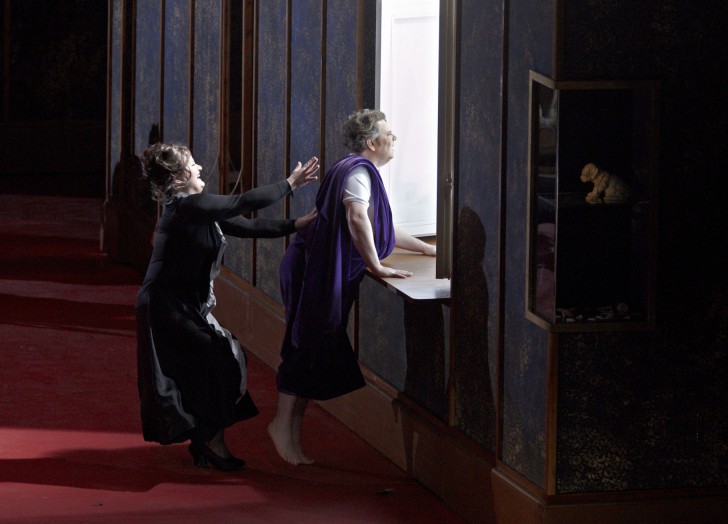 La première partie justifie la démarche des deux metteurs en scène, plus même qu'un spectateur déjà aguerri à la version habituelle aurait pu le croire. Le décor d'Anna Viebrock, sans nul doute la plus grande décoratrice de théâtre d'aujourd'hui, reconstitue le foyer de la salle de la création de 1912, comme celui de 2001 avait joué avec celui du Großes Festspielhaus salzbourgeois où le spectacle avait lieu ; pourtant, les deux mises en scène comme les deux décors, malgré leurs auteurs identiques, sont extrêmement différentes. Ce n'est pas qu'il n'y ait pas de points communs : l'idée d'une fraternisation entre les deux femmes, par exemple, était déjà présente en 2001, et l'alcool y jouait un rôle similaire ; mais les termes de l'entente ne sont plus tout à fait les mêmes : ici, Ariane retrouve suffisamment d'envie de vivre pour faire littéralement la conquête d'un pleutre Bacchus sorti traumatisé des bras de Circé. On y perd sans doute une partie de la mélancolie du spectacle de 2001, où les matériaux froids de l'architecture 1960 dessinaient un monde hostile – alors que cette Ariane 2012 vit dans les formes élégantes de la Belle époque, où certes elle semble condamnée au début du spectacle aux supplices de l'attente – rien qui ne ressemble tant à une salle d'attente qu'un foyer de théâtre –, mais avec tout le confort moderne. Bacchus n'est pas ici un accomplissement, tout au plus une étape de plus dans les efforts d'une grande bourgeoise pour se désennuyer.