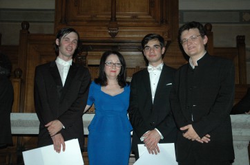 Photo de gauche à droite : , 1er prix ; Svetlana Eganian, Présidente et directrice artistique du Concours International de Piano de Lyon ; , 3e prix ; et , 2e prix. ©CIPL