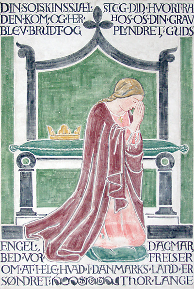 La princesse Markéta (Marguerite), princesse de Bohême, fille du roi Přemysl Otakar 1er et demi-sœur de sainte Agnès de Bohème, devient reine du Danemark, sous le nom de Dagmar, en épousant en 1205 à Lübeck le roi Valdemar II dit le Victorieux. Elle est née vers 1186, fille et roi… et de sa première épouse, Adleta de Meissen. Ce roi Premysl Otakar 1er menait une politique dynastique habile en unissant les siens à différentes familles européennes. Ainsi trouva-t-il pour sa fille aînée un mari très influent, que l'on considère comme l'un des rois les plus importants de l'histoire du Danemark, mariage arrangé bien sûr, sans amour ni romantisme aucun, le but suprême étant de réunir solidement les deux royaumes.