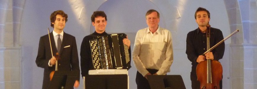 Dans un registre plus contemporain, Hymnit, œuvre du compositeur finlandais Ilkka Kuusisto pour violoncelle et accordéon (2000), fut une belle surprise, le public s'étant laissé porter par ce phrasé clair et éloquent. Enfin, c'est sans aucun doute dans le trio Apparitions de Philippe Hersant que les trois complices montrent l'étendue de leur talent: la pièce, écrite pour cette formation encore (trop) méconnue déploie une riche palette sonore ; l'écriture y exploite toutes les possibilités de l'accordéon, celui-ci devenant alors un souffle générateur dans lequel surgissent, vibrent ou se fondent violon et violoncelle. En somme, un programme varié servi par des interprétations toujours pleine d'humanité ; une générosité qui d'ailleurs ne se limite pas à ce festival puisqu'à l'initiative d'Anne-Marie Sallé, ce trio prometteur sera de retour à Clairvaux pour un concert de Noël, auprès des détenus cette fois-ci.