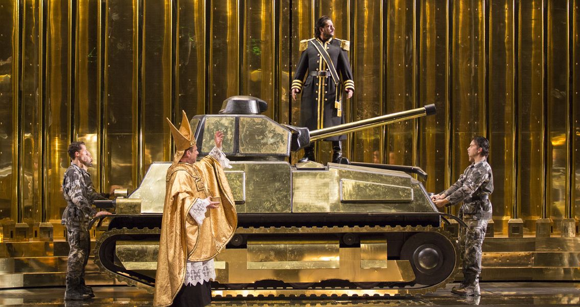 Pourtant, tandis que la balustrade dorée évoquant vaguement quelque colonnade égyptienne et divisant verticalement la vaste scène, s'ouvre, glisse, se mue en puissant palais métallique, puis en une sorte d'artefact cuivré du monument à Victor Emmanuel II (la « machine à écrire » de la Piazza Venezia, à Rome), l'on reconnaît la patte d'Olivier Py, ce sens surréaliste de l'espace transformé en arène de cauchemar. Les pistes interprétatives – toutes plus insignifiantes les unes que les autres – se multiplient : puisque le Roi d'Egypte est grimé en François Joseph et brandit les couleurs autrichiennes, Aïda et son père représenteront l'Italie du Risorgimento s'émancipant de la puissance impériale. Mais, alors, que viennent faire ici ces GI en treillis, ces mitraillettes, ce char d'assaut (plaisamment béni par Ramfis) ? Non, on assiste plutôt à la libération de l'Ethiopie des années 1940, secouant le joug du pouvoir fasciste. Mais, alors, pourquoi ces manifestants brandissant des pancartes « Les étrangers dehors », durant la scène de triomphe ? N'est-ce pas plutôt à une parabole sur l'occident néo-colonialiste et capitaliste que nous sommes conviés ?