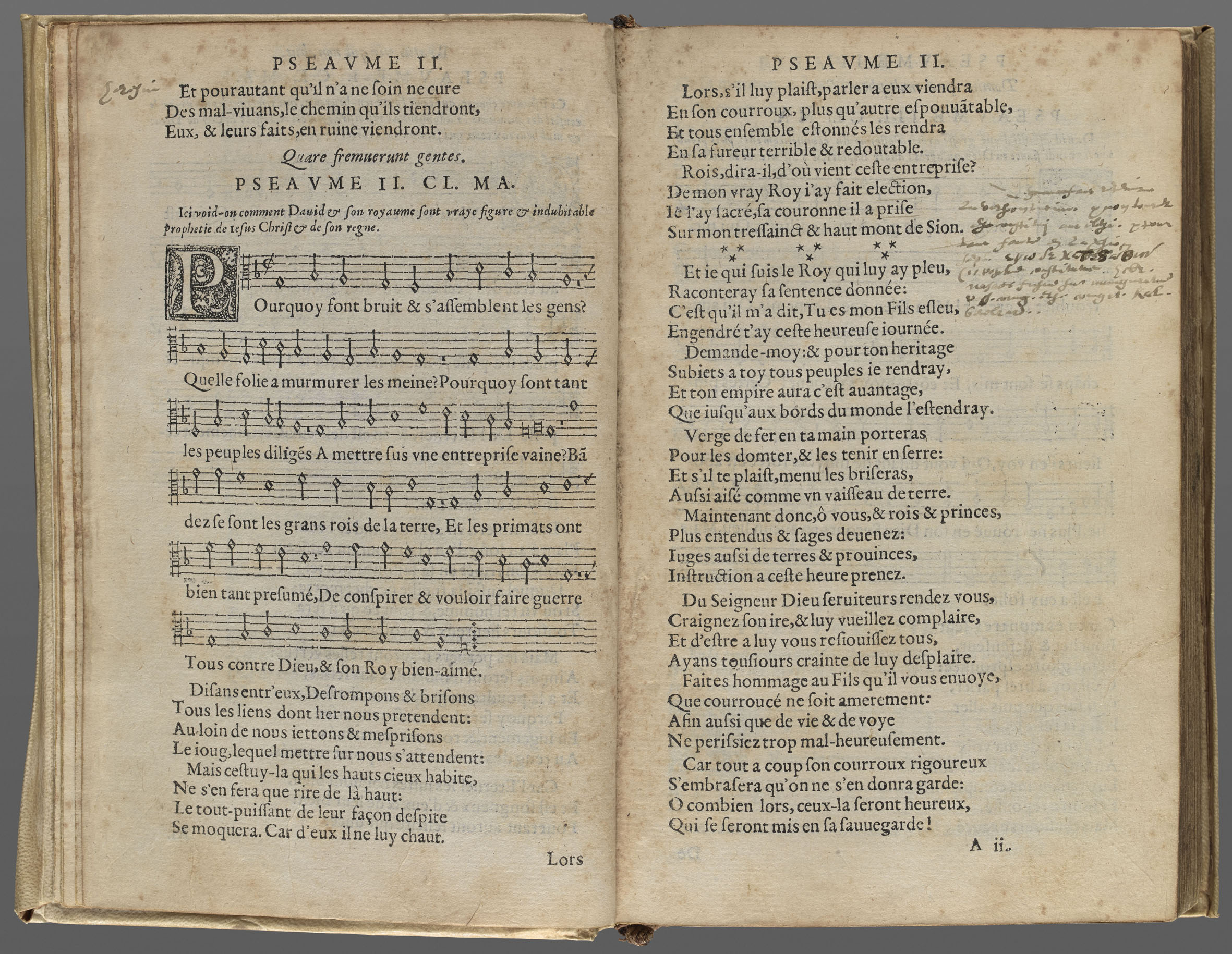 Crédits photographiques : Zacchia Paolo, Portrait d'un joueur de viole, huile sur bois,89,1 x 62,5 cm. Paris, musée du Louvre, département des peintures. © RMN-Grand Palais (musée du Louvre) / Franck Raux ; et , Psaume II : « Quare fremerunt gentes », Livre : « Les psaumes mis en rimes françoises », édition Antoine Vincent, 1562. Papier imprimé et vélin (couverture), ouvert : 19,6 x 26 cm. Ecouen, . © Rmn-Grand Palais (musée de la Renaissance, château d'Ecouen) / Adrien Didierjean