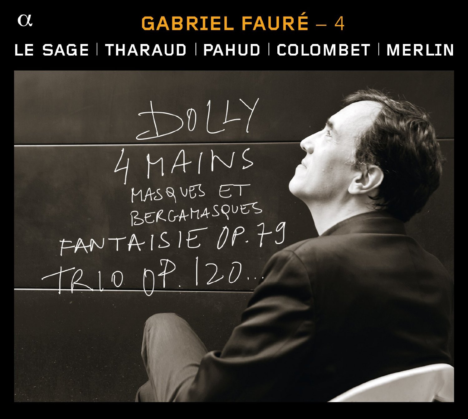 Gabriel Fauré (1845-1924) : Dolly op.56 pour piano à 4 mains ; Masques et Bergamasques op.112 pour piano à 4 mains;Souvenirs de Bayreuth, « fantaisie en forme de quadrille… de Richard Wagner » pour piano à 4 mains ; Fantaisie op.79 pour flûte et piano ; Morceau de concours pour flûte et piano ; Sicilienne de Pelléas et Mélisande op.78 pour flûte et piano ; Trio op.120 pour piano, violon et violoncelle ; Après un rêve pour violoncelle et piano ; Sicilienne op.78 pour violoncelle et piano. Éric Lesage, Alexandre Tharaud, piano ; Emmanuel Pahud, flûte traversière ; Pierre Colombet, violon ; Raphaël Merlin, François Salque, violoncelles. 1 CD ALPHA 603. Code barre : 3760014196034. Enregistré en octobre 2012 à la MC2, Maison de la Culture de Grenoble. Notice bilingue (français-anglais) documentée de Nicolas Southon. Durée totale : 70’32