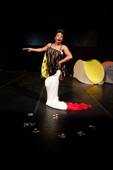 Elisabeth Bakambamba Tambwe, la Congolaise, a compris qu'elle ne pourrait jamais être un papillon, malgré le titre long et alambiqué du spectacle. En attendant, elle rampe au milieu des tentes Quechua dont elle a fait son ordinaire. Chenille devenue chrysalide dans son incroyable robe tube, elle se transforme à vue en Loïe Fuller tapette à mouche, en Grace Jones performeuse ou en meneuse de revue dégustant des chenilles séchées. L'occasion d'invoquer des figures noires de la soul ou de la politique afro-américaine, comme Aretha Franklin, Bessie Smith ou Angela Davies. Epatant !