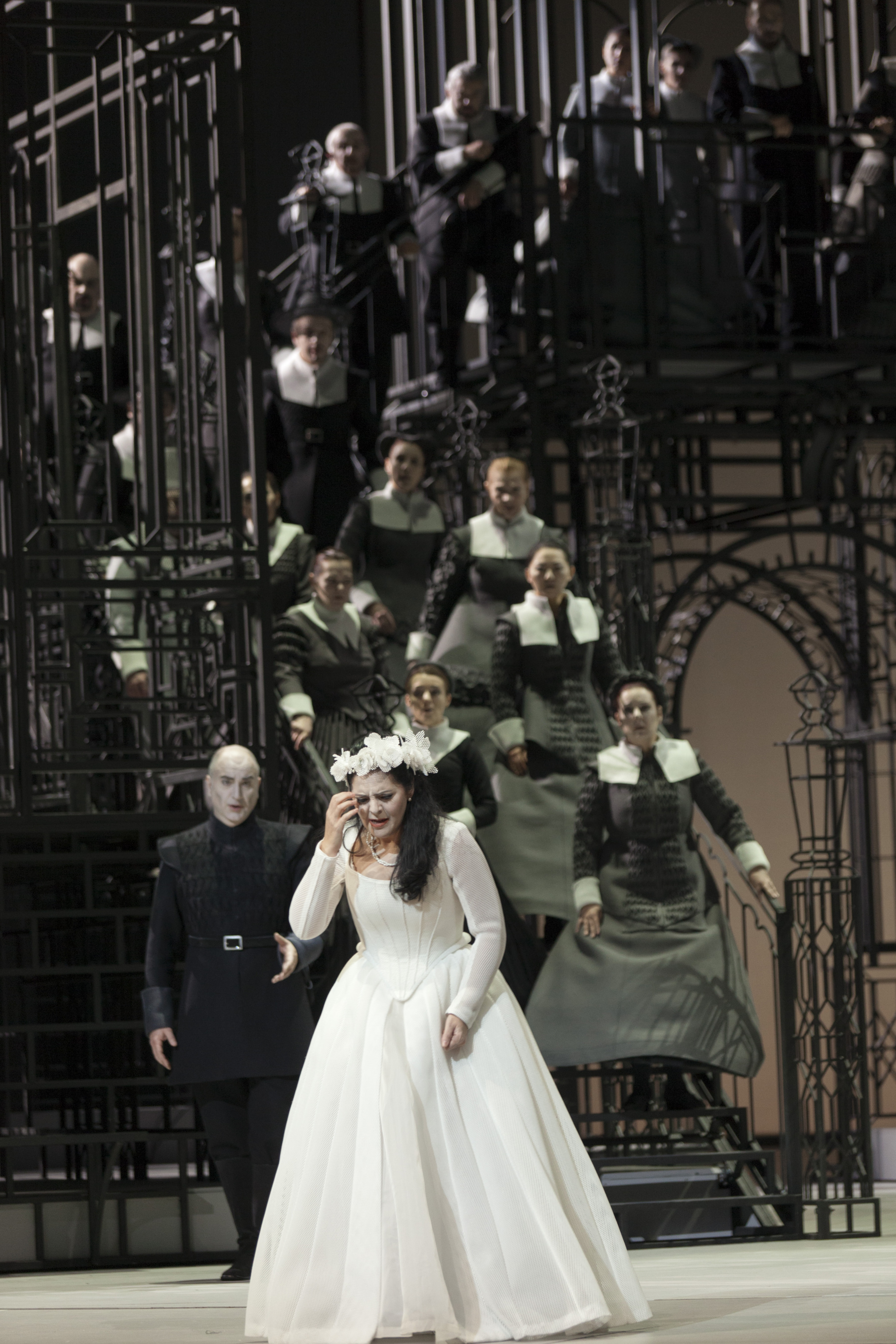 Pour la première fois depuis fort longtemps en ces lieux, le metteur en scène n'a pas été hué, et même au contraire très applaudi. Pourtant, force est d'avouer qu'on a connu Laurent Pelly bien plus éclatant. Dans un décor gris de treillages, stylisant d'assez belle manière un château, l'action se déroule à la fois sans heurts et sans surprises. Les costumes, dans des tons noirs et beiges, sauf l'éblouissante robe blanche d'Elvira, sont d'époque. Les protagonistes entrent, sortent, expriment leur affect dans des déplacement bien réglés. Pas de quoi se pâmer, pas de quoi s'outrer non plus. C'est une vision un peu tiède, où l'on évite cependant de s'ennuyer.