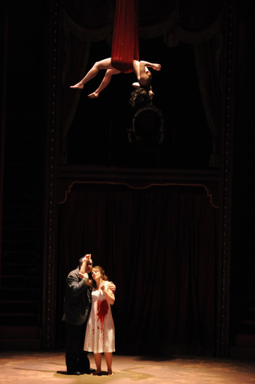 La transposition, habituelle chez Carsen, dans l'univers du spectacle passe cette fois par la métaphore du cirque, suggérée par le personnage du bouffon Rigoletto ici devenu clown : fausse bonne idée qui se heurte plus d'une fois au texte, réduit la complexité psychologique des personnages et parasite souvent l'expression des émotions. On regrette également certaines facilités voire trivialités dont Robert Carsen aurait pu aisément se dispenser, comme ces femmes tigresses quasiment nues et se trémoussant lascivement sous le fouet d'un dompteur ou comme ces poupées gonflables qu'exhibe complaisamment Rigoletto. En revanche, le strip-tease intégral du ténor, qui avait tant fait glousser la blogosphère à Aix, a disparu, ce dernier terminant simplement en caleçon avant d'aller rejoindre sa Gilda. Mais on retrouve tout de même l'unicité de la conception, assumée et tenue de bout en bout, le soin apporté aux décors, costumes et lumières, la précision et la véracité de la direction d'acteurs, la fulgurance de certaines images (Monterone dévoilant le cadavre nu de sa fille, le «Caro nome» de Gilda en apesanteur sur un trapèze sous la voûte nocturne étoilée, la chute finale d'une ballerine depuis les cintres à la mort de Gilda au centre de l'arène).