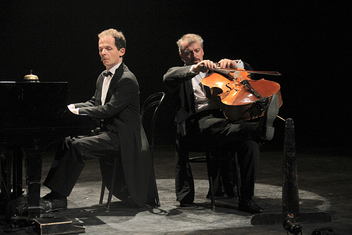 Paris, Salle Gaveau, 21-XII-2013. Duel Opus 2. Spectacle musical. Mise en scène : Agnès Boury. Avec : Laurent Cirade, violoncelle, scie musicale, percussions et autres instruments ; Paul Staïcu, piano, piano-jouet, percussions et autres instruments.