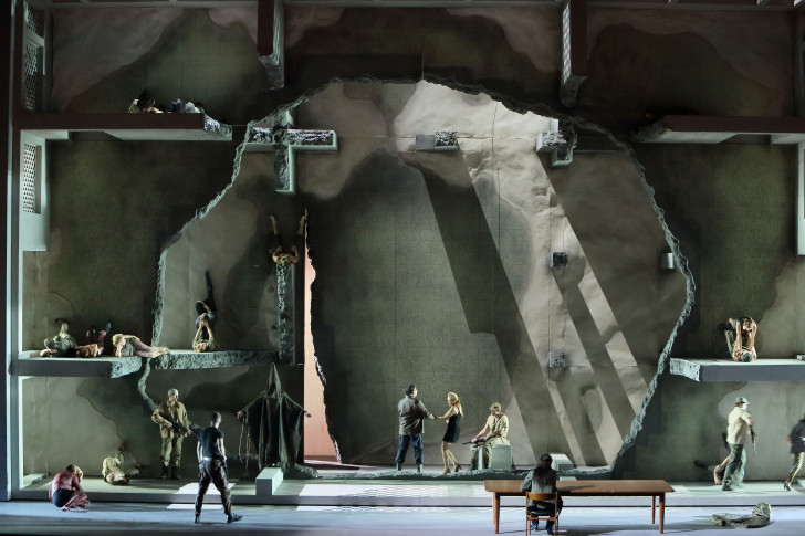 À vrai dire, la mise en scène de Martin Kušej ne parvient pas vraiment mieux à justifier la nécessité dramatique de l'opéra. Son travail, sans nul doute, est soigné et le plus souvent agréable à regarder, même quand il montre sur scène, avec raison, les horreurs de la guerre qui forment l'arrière-plan de la partie médiane de l'opéra. Il faut bien dire, cependant, que le public d'aujourd'hui n'est plus habitué à voir le spectacle interrompu sans cesse par de trop longs précipités, qui tuent ce qui peut rester d'intérêt dramatique pour ne révéler que des décors banals. Quand Kušej place en fond de scène un immeuble visiblement évidé par une bombe, en mémoire du 11 septembre, on ne peut nier que l'effet est impressionnant ; mais si c'est pour faire jouer les personnages en avant-scène sans véritable interaction avec ce décor, on ne peut s'empêcher de penser qu'une simple vidéo aurait aussi bien fait l'affaire. Le spectacle n'a pas choqué le public, il ne sombre pas dans une convention mortifère, mais il n'intéresse pas vraiment : dans d'autres maisons, de tels spectacles sont la norme, mais l'Opéra de Bavière nous avait habitués à mieux.