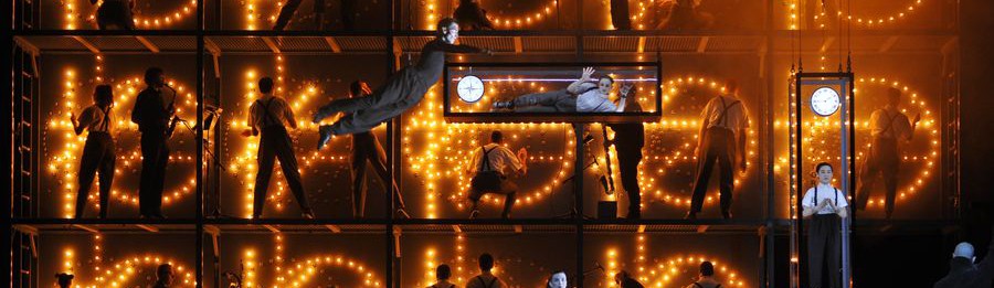 Paris, Théâtre du Châtelet. 8-I-2014. Philip Glass (né en 1937) : Einstein on the Beach, opéra en quatre actes sur un livret de Robert Wilson, Lucinda Childs et du compositeur, avec des textes additionnels de Christophe Knowles et Samuel L. Johnson. Création mondiale de la troisième version. Mise en scène et décors : Robert Wilson ; costumes : Carlos Soto ; lumières : Robert Wilson et Urs Schönebaum ; maquillages et coiffures : Luc Verschueren ; régie son : Kurt Munkasci ; chorégraphie : Lucinda Childs. Avec : Antoine Silverman, Einstein ; Helga Davis, Kate Moran, actrices ; Jasper Newell, le garçon ; Charles Williams, Mr. Johnson. Lucinda Childs Dance Company, The Philip Glass Ensemble, direction : Michael Riesman