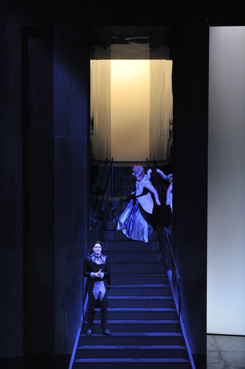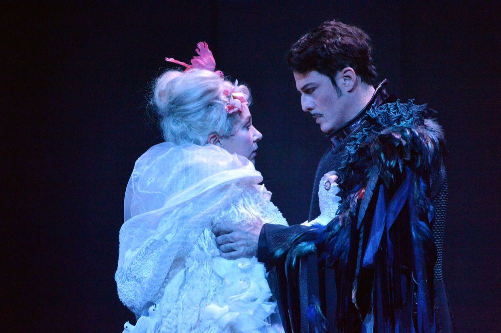 Et comme souvent avec Juliette Deschamps, la fumée et la neige sont au rendez-vous, comme une sorte d'exercice obligé ou de gimmick récurrent. Passé ce détail, la metteuse en scène offre une vision oscillant entre réalisme et distanciation du chef d'oeuvre de Bartók. Réalisme, car Barbe-Bleue, au fur et à mesure de l'ouverture des portes, exprime ses sentiments. Distanciation par les costumes, directement inspirés des mangas japonais et des films d'animation de Miyazaki. Judith apparaît dans une somptueuse robe de poupée avec arceaux, sorte de fille-enfant qui va découvrir l'univers des adultes ; Barbe-Bleue est décoré d'un couvre-chef fait d'un hibou géant, peu à peu il enlève ses accessoires et décorations pour n'être plus qu'un homme. Pendant ce temps son aimée voit des traces bleues envahir son habit puis ses mains qu'elle colle sur la barbe de son mari au moment de l'assassinat final. Barbe-Bleue devenu homme ne supporte plus cet être irréel qui a percé ses secrets les plus profonds et qui se couvre de son sang – bleu, forcément. Bien sûr le propos de Béla Balász, l'auteur du livret, a subit quelques entorses : Judith n'est plus emprisonnée, les portes ne laissent plus apparaître les couleurs qui égayent le château, les clés sont virtuelles. Témoin d'une courte mode symboliste et mystique – disparue avec la Première Guerre Mondiale – avec Maurice Maeterlinck, Gabriele D'Annunzio ou Konstantin Balmont, cette esthétique paraîtrait terriblement datée si elle était respectée à la lettre. Avec Juliette Deschamps, si la lecture n'est pas aussi radicale que celle de Patrice Caurier et Moshé Laiser à Nantes ou aussi épurée que celle de Jean-Paul Scarpitta à Montpellier, elle n'en n'est pas moins intelligente et pensée.
