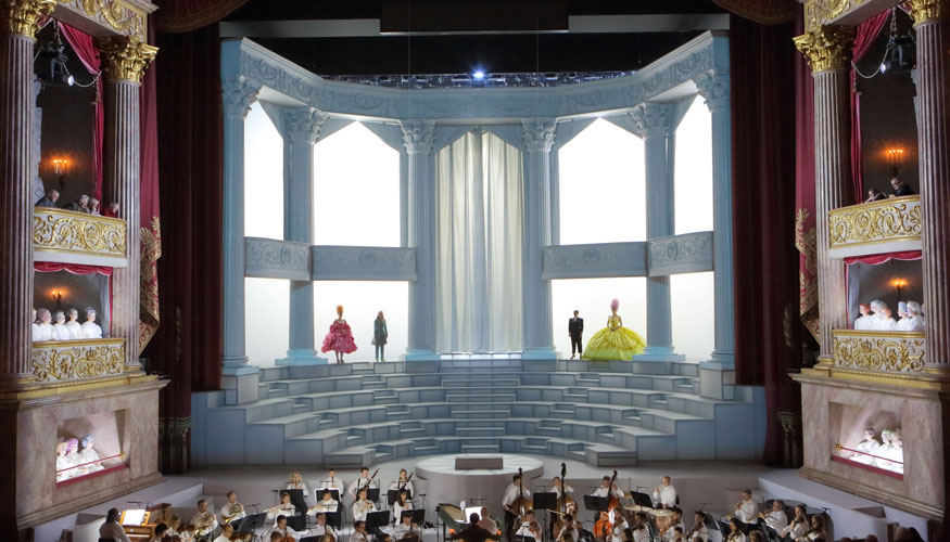 On pouvait pourtant fonder quelques espoirs sur Jan Bosse, qui a certes déjà produit quelques opéras ici et là, mais a surtout une expérience respectable de metteur en scène radical, en particulier à Berlin. Sa mise en scène, reconnaissons-le, saura s'inscrire durablement au répertoire de la maison, tant elle est claire et passe-partout, et ce n'est pas un moindre mérite. Pour le reste, on doit bien avouer s'être fermement ennuyé devant ce spectacle qui manque autant d'idée directrice que de travail des détails. Le premier acte s'ouvre sur un décor qui prolonge et imite celui des loges d'avant-scène du vénérable Nationaltheater : combien de centaines de productions d'opéra, ces trente dernières années, ont eu cette même idée de représenter tout ou partie du théâtre où se déroule le spectacle ? Au second acte, même structure, mais sans ornements : restent un amphithéâtre de praticables à nu et une vue saisissante des installations techniques des hauteurs du théâtre – qu'on a pareillement déjà vu mille fois. Les costumes jouent la carte du décalage, sous la forme de costumes à l'antique aux formes exagérées, comme s'ils n'étaient que des accessoires de bal masqué modernisé : c'est le minimum syndical, ce n'est pas désagréable, c'est branché – ce n'est pas assez.