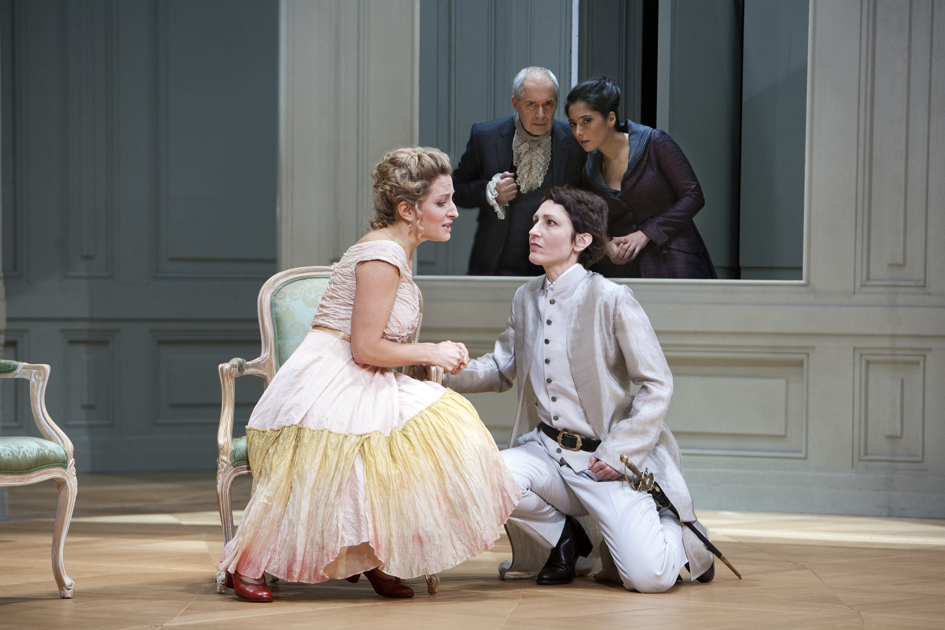 Dépouillée de son contexte et de ses ornementations rococos, l'action est pourtant résolument ancrée dans le XVIIIe siècle, notamment au premier acte où tout est fait pour rappeler les multiples parallèles de l'intrigue de Hofmannstahl avec Les Noces de Figaro. Un simple cadre de boiseries, un lit situé au milieu de la pièce ainsi que quelques accessoires constituent l'unique décor du premier acte, espace clos et fermé à la lumière qui renferme l'intimité et la vie privée des personnages. Les multiples visites qui rythment l'action constituent autant d'intrusions insupportables dans un univers privé d'oxygène, cloisonné et replié sur lui-même. Le deuxième acte, au palais de Faninal, est le plus réussi des trois. Illuminé d'un vaste puits de lumière, il signale une ouverture sur le monde et sur l'espace public qui fournit un peu d'air à l'univers aristocratique confiné du début de l'ouvrage. Le troisième acte se situe clairement au XXe siècle, vraisemblablement à l'époque de la création de l'opéra. Le départ d'Ochs, puis celui d'une Maréchale plus en colère que résignée, suggèrent la fin d'un monde ancien mis à mal et remplacé par l'arrivée de nouvelles classes sociales mais aussi de nouvelles valeurs économiques et morales. De fait la mise en scène, qui visiblement privilégie la comédie sur le pathos et sur le drame intérieur, rejette autant le sentimentalisme indissociable de cet opéra que le poids des diverses traditions scéniques interprétatives : dès le début du premier acte, Quinquin et « Bichette » semblent n'avoir plus rien à se dire autour de la table du petit déjeuner sinon quelques mots doux qui sonnent creux ; la Maréchale, plutôt que de se contempler dans le miroir à la fin du premier acte, referme sa coiffeuse d'un geste presque rageur. Au deuxième acte, Octavian commence par s'adresser à Marianne Leitmetzerin, qu'il prend par erreur pour Sophie. À la fin du troisième acte les jeunes orphelines, surgies de la coulisse, se jettent toutes les trois sur le fameux mouchoir de la Maréchale dont elles semblent se disputer les rares vestiges. Dans cet univers cruel et décadent, Ochs et ses sbires apportent finalement un soupçon de fantaisie et de liberté même si leur déchéance morale n'en est que plus patente…