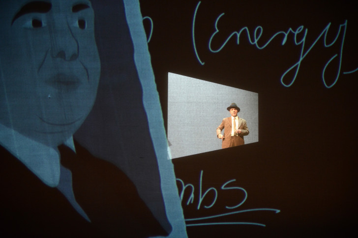 Glass/Wilson et Adams/Sellars sont les tandems américains les plus excitants du moment. De Doctor Atomic, on ne connaît que la mise en scène de Sellars. La nouvelle production de Karlsruhe, confiée au jeune metteur en scène américain Yuval Aron (un nom à retenir), offre un premier acte renversant de virtuosité. Le cadre en cinémascope de l'immense scène du Badisches Staatstheater est tendu d'un écran quadrillé sur lequel on peut lire, avec une police très années 50, le titre de l'opéra. Cet écran ne sera pas levé de tout ce premier acte. Au moyen d'habiles transparences, il servira à faire apparaître, par delà des images projetées, une infinité de lieux différents sur la hauteur du plateau et, surgissant par de magiques effets de glissières : bureau, laboratoire, intérieur de l'atome… Cette utilisation extrêmement inventive et très cinématographique de l'espace, qui fait des chanteurs des marionnettes placées loin des spectateurs, atteint des sommets dans la scène 2 entre Kitty et Oppie, les deux époux étant séparés, chacun dans deux décors différents : Kitty dans le salon à jardin, la chanteuse étant doublée par un figurante, et Oppie à cour dans une somptueuse bibliothèque. Avec cet acte de bout en bout spectaculaire, on en viendrait à oublier la vision originelle de Sellars.