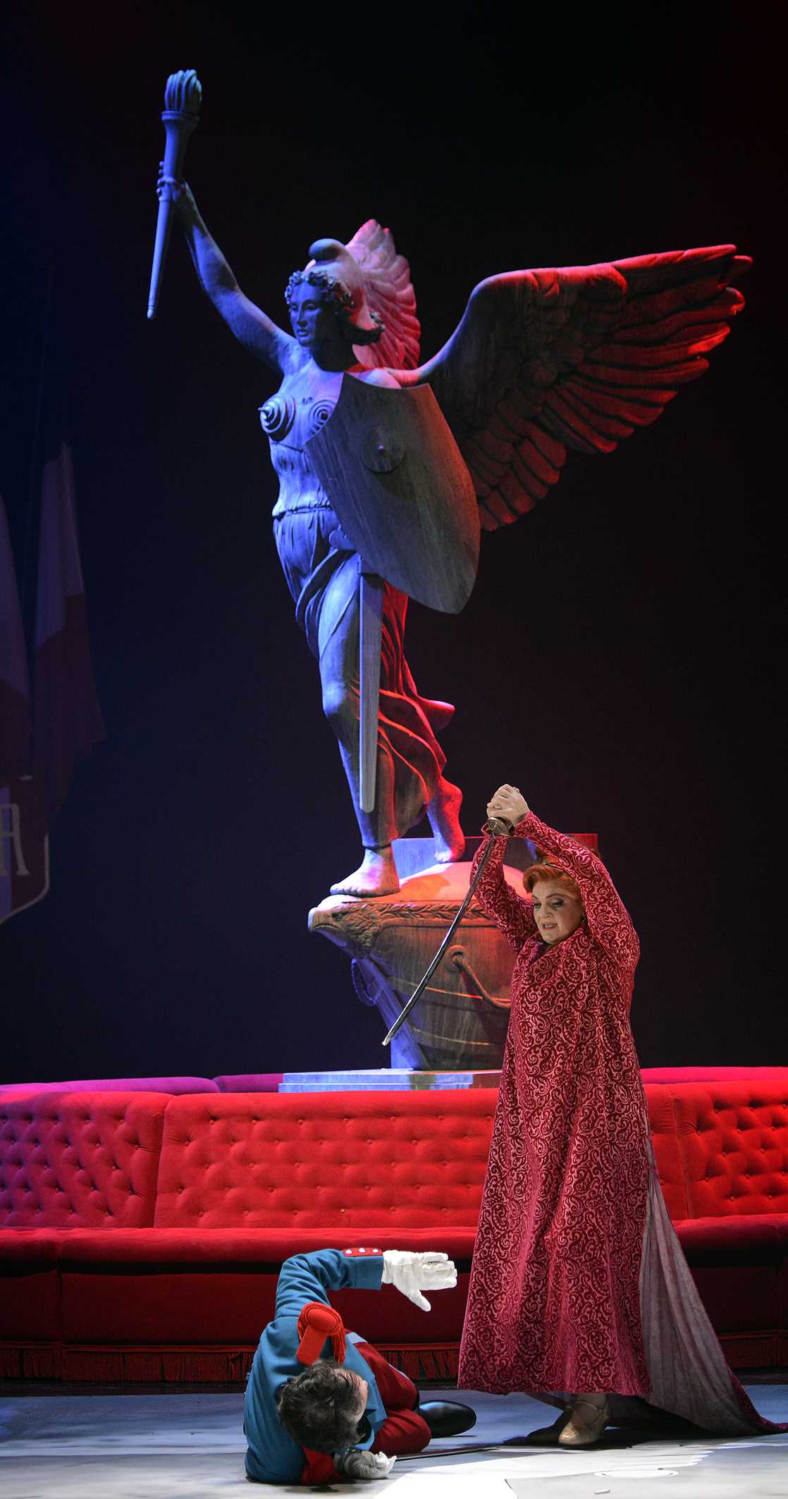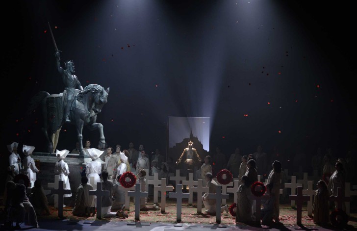 Las ! Au sortir de la première, force est de constater que cette nouvelle production ne contribuera pas à réhabiliter Le Roi Arthus et conduit même à s'interroger sur sa viabilité. Et cela, en raison de deux points noirs majeurs. Le premier s'appelle Keith Warner et son équipe, dont la mise en scène déroute et ne convainc pas. A quoi bon transposer l'action dans l'armée française au début de la Première Guerre Mondiale (quartier général des opérations au premier acte, entrepôt d'obus au second et poste médical avancé au dernier), si c'est pour ne rien en tirer, ni lisibilité de l'action, ni éclaircissement des comportements, ni approfondissement des psychologies ? Dans les décors écrasants et surchargés aux statues colossales de David Fielding, sous les éclairages crus et agressifs de John Bishop, nulle vie, nul théâtre n'habitent le plateau, rançon d'une direction d'acteurs aux abonnés absents qui abandonne les chanteurs à leur répertoire de geste stéréotypés quand elle ne leur impose pas des déplacements erratiques et sans logique. Si l'apparition de Merlin dans un pommier inversé tombant des cintres est plutôt réussie – mais pourquoi, dans le contexte de 1914, en faire un vieillard cacochyme à la barbe fleurie que ne renierait pas l'imagerie d'Epinal ?–, l'apothéose finale d'Arthus, qui troque sa tenue militaire pour une armure 100% moyenâgeuse et assiste sous une pluie de pétales de roses à l'érection de sa monumentale statue, touche au kitsch et au ridicule.