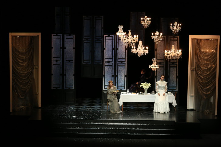 La mise en scène proposée à l'Opéra-Théâtre de Metz-Métropole est la reprise d'un spectacle monté en mai 2012 au Théâtre Roger Barat d'Herblay (Val d'Oise). Les deux premiers tableaux, excessivement statiques, sont essentiellement dominés par le somptueux décor de Christophe Ouvrard dont la scénographie labyrinthique suggère à merveille cet univers onirique et mystérieux, à mi-chemin entre les horreurs gothiques d'un roman de Bram Stoker, la cruauté fantasque d'un conte de Grimm et l'évanescence d'une pièce de Tchekhov. La neige envahissante, les lustres de cristal dont la glace contraste avec le feu et les souffrances des trois femmes qui habitent ce monde délétère, la maison de poupées placée au centre du plateau au lever du rideau, tout cela offre le cadre idéal pour la dissection entomologique que vont traverser les principaux personnages du drame. L'occupation de l'espace, avec un ballet de serviteurs muets parfaitement orchestré, prépare le spectateur au huit-clos dramatique qui va suivre.