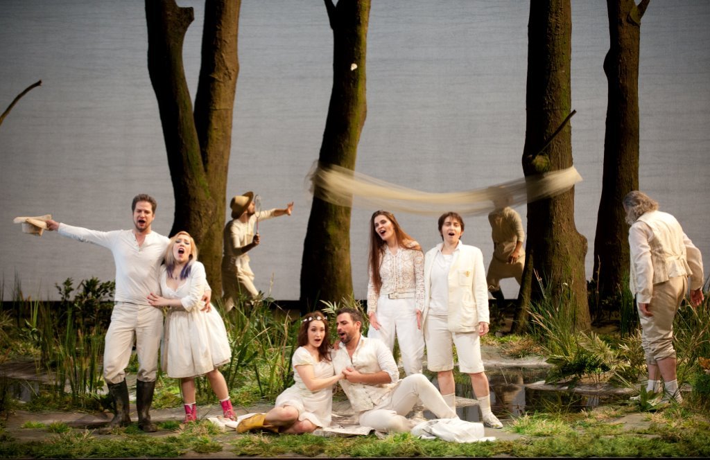 On adore la mise en scène pleine de subtilités mais aussi pleine de simplicité. Deux tableaux différents soulignent l'évolution de l'action et des cœurs. Le metteur en scène, les éclairagistes, la costumière ont tenu à illustrer ce que l'on pourrait appeler le monde social et contraint du début de l'action par l'évocation du jardin discipliné représenté par des pots et des bacs à fleurs, que transportent avec beaucoup d'à-propos des jardiniers en fond de scène. La masse de ces accessoires varie en fonction de l'action avec souvent des clins d'œil : on retiendra l'arrivée d'une plante carnivore sur scène pendant l'air d'Arminda Si promette facilmente… Par opposition, le deuxième tableau, le revers du premier au sens propre, montre le désordre qui règne dans les cœurs dès la fin du second acte : une forêt, des herbes folles ou peuvent se cacher ceux qui se cherchent sont du plus bel effet. Les costumes blancs tout au long de l'opéra donnent bien cette impression de jeunesse et de candeur (au sens propre) qui traduit cet élan vital si caractéristique de la musique de Mozart.