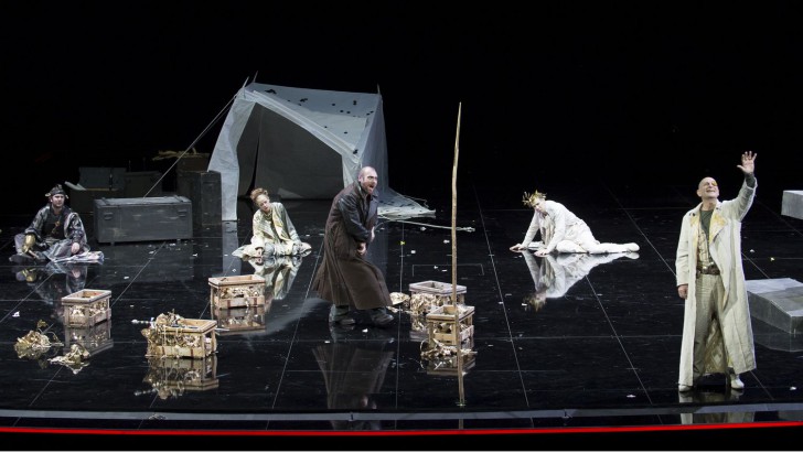 Dieter Dorn nous fait échapper à tout cela dès l'image initiale de son Or du Rhin. Le rideau est levé. Le décor marbre anthracite de ce théâtre vide, lieu de tous les possibles, avec son sobre diaporama d'images de notre Monde en folie, séduit d'emblée.