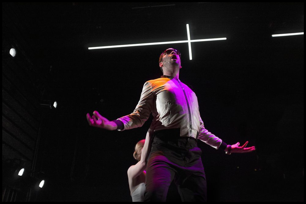 Peu de décors sur le plateau de l'Athénée mais un jeu de lasers et de lumière pour suggérer très efficacement le luxe des lieux. Chacun des simulacres, ceux de l'Evêque, du Juge, du Général puis de la Reine, invite sur le plateau des instrumentistes costumés jouant respectivement du strohviol (violon midi avec pavillon), puis de la clarinette contrebasse, de la trompette et du cor : une volonté de Péter Eötvös d'associer ces instruments quasi théâtraux à la scène un rien déjantée qui est en train de se jouer. Rehaussée par la qualité des costumes, la mise en scène de Damien Bigourdan, fluide et inspirée – la scène du « cheval » et du « général » est particulièrement réussie – insuffle à tout ce petit monde une énergie sans faille. Tout est amplifié, car tel est le parti pris de l'ensemble Le Balcon, maintenant un niveau sonore à haute tension dans cet espace un peu trop confiné mais avec un parfait équilibre entre les forces en présence. Dans la fosse, l'ensemble Le Balcon, sous la direction énergétique de Maxime Pascal, sert au mieux une partition gorgée de couleurs, de rythmes et de trouvailles insolites.