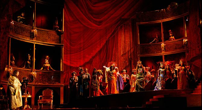 L'éblouissante production de Nicola Raab, car elle vous éblouit, littéralement, par ses ors, ses cramoisis et ses pourpres, enchante et convainc. Les décors et costumes de Johan Engels nous plongent dans un monde de panneaux décoratifs, de posters, ceux d'Orazi, bien sûr, mais aussi ceux de Muchat ou de Chéret. A l'Acte II nous ne sommes plus chez Thaïs mais chez l'orientaliste Loti. La mise en situation de Raab, un brin ésotérique (qui sont donc ces messieurs en frac et hauts-de-forme à l'Acte III ?…. et pourquoi cette robe de mariée au final ? … pour que nous comprenions bien que notre courtisane a épousé le Christ ? Pour nous rappeler la Sanderson ?) sait cependant interpeller.