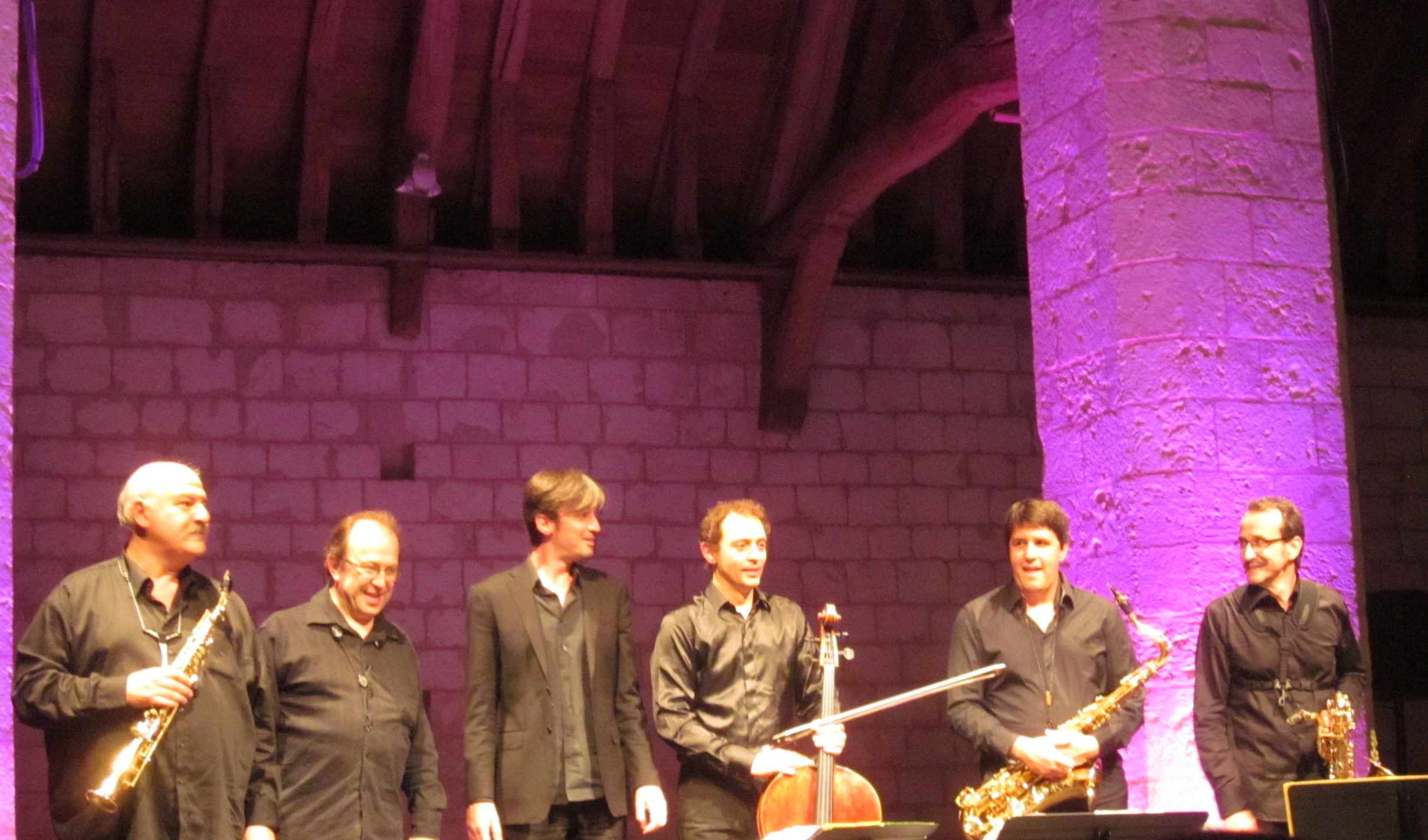C'est ainsi que le concert « Revolts » évoque la Grande Guerre avec notamment la création mondiale de Suite et Liesse d'Olivier Calmel. L'œuvre est divisée en deux parties de trois mouvements chacune, dans l'ensemble bien rythmé, avec des citations entre autres de Dutilleux et de Dukas (Apprenti sorcier) et quelques notes de jazz. Attachée à la tonalité, sauf le premier mouvement en hommage à son père Roger Calmel (référence à une tendance musicale au milieu du 20e siècle), la pièce met en valeur les sonorités de chacun des quatre saxophones et le violoncelle, traités comme un quintette. Lumineuse, elle exprime la joie euphorique de soldats en partant en guerre. En effet, en faisant des recherches dans de nombreuses archives, le compositeur a constaté que « les conscrits étaient enthousiastes car inconscients de ce qui les attend et certains que la victoire sera facile », comme rapporte les notes du programme. L'œuvre renferme de nombreuses idées et références (polyrythmie, jazz, jeux binaire/ternaire, Chostakovitch, John Adams…) sans pour autant tomber dans un passéisme banal, au contraire, il y a là quelque chose d'éminemment original. Si le Quatuor de Singelée s'apparente à une écriture de quatuor à cordes tout à fait classique, pour célèbrer les 200 ans d'Adolphe Sax (1814-1894), les arrangements par Philippe Portejoie de Debussy et de Schœnberg ainsi que ses propres compositions (Valse énigmatique, XASTB et Liberté) sont ingénieusement adaptés aux saxophones, qui nous offre une occasion de redécouvrir ces instruments.