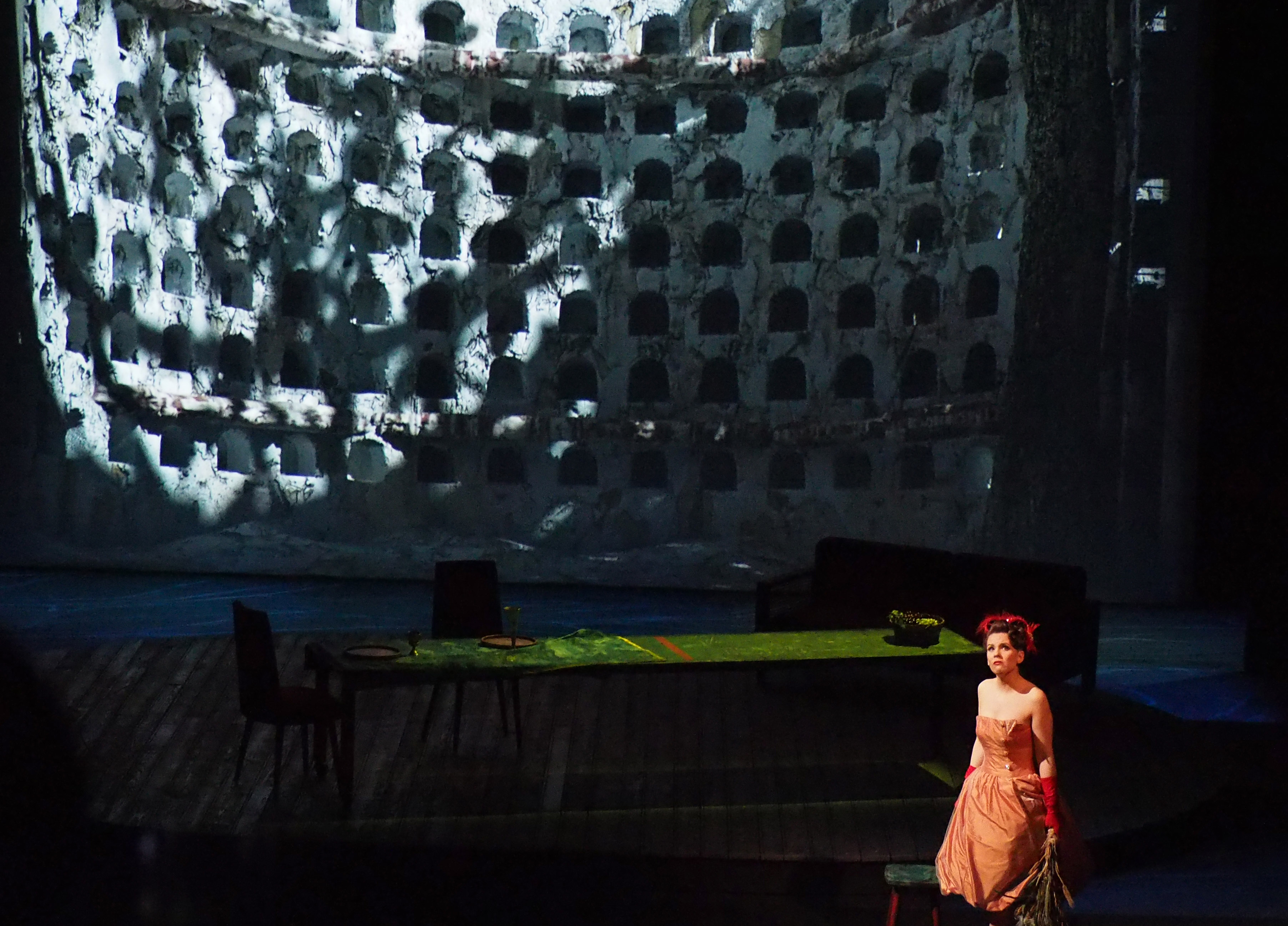 Le plus impressionnant dans La Colombe, ce sont ces images numériques qui se projettent sur la toile de fond, images en haute définition, traitées de manière poétique, semblables à des décors peints. Au fur et à mesure du déroulement de l'intrigue, elles se transforment tour à tour en différentes sortes de murs — à fresque, avec fenêtre, en bois, doublé de grilles à l'instar d'une cage d'oiseaux, ou encore avec la peinture tombant en mille morceaux — mais aussi une sorte d'amphithéâtre antique en ruine. Les transformations sont continues et parfois si discrètes qu'un instant après le spectateur est face à un autre « décor » sans qu'il ne s'en rende compte. Sur chaque image, le jeu de lumière, tel qu'il se produit avec le mouvement du soleil, donne naturellement des rythmes à la scène qui, elle, est statique et ornée uniquement d'une table longue, d'un canapé et de deux chaises. Conçues par Stéphane Vérité et Romain Sosso et produites par ce dernier, ces peintures numériques sont elles seules une œuvre d'art à part entière. Mais devant ces magnifiques « décors », il faudra dire, malheureusement, que les quatre chanteurs ne possèdent pas le même degré de perfection. Tous manquent encore de maîtrise vocale, qui fait transparaître des défauts techniques parfois clairement audibles ; le jeu de certains est exagéré, à notre sens peu adapté au caractère de la pièce, leur dialogue (puisque c'est un opéra-comique) sans rythme…