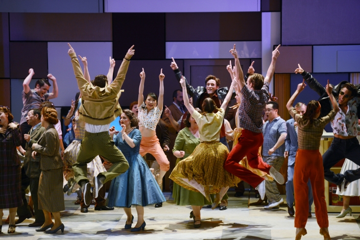 Le cadre de l'action est celui des Trente Glorieuses, cette époque de (faux) rêve où tout semblait possible, même l'improbable : parfait pour la trajectoire de Platée, amoureuse de Jupiter et émouvante comme jamais dans son rêve de faire partie de ce milieu ripoliné, où le vertige des robes serrées aux tailles de guêpe des filles éventaient les sourires ultra-bright des James Dean en jean et lunettes fumées. L'astucieux décor de Julia Hansen est celui d'un intérieur américain qu'on a déjà beaucoup moqué : décor d'intérieur où règne en femme d'intérieur une Junon que l'on croirait sortie des films The Hours et Loin du Paradis. Décor madeleine de Proust pour tous donc, avec l'irruption du premier réfrigérateur, de la première télévision, du premier aspirateur… éléments indispensables du bonheur humain d'après-guerre. Décor intelligent d'une simple paroi de laquelle coulisseront lit, bar, escaliers, salle de bain, stores, et même une rutilante Thunderbird,… Mariame Clément y pose tous les enjeux de sa conception. Il n'y a plus qu'à agiter avant emploi…